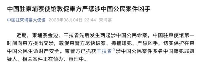 8月4日深夜,中国驻柬埔寨大使馆发布消息,近期,柬埔寨金边、干拉省先后发生两起涉中国公民命案。中国驻柬使馆第一时间向柬方提出交涉,敦促柬警方尽快破案、抓捕嫌犯、严惩凶手,切实保护在柬中国公民生命财产安全。柬警方已抓获干拉省涉中国公民案件多名中国籍犯罪嫌疑人。相关案件正在侦办、审理中。